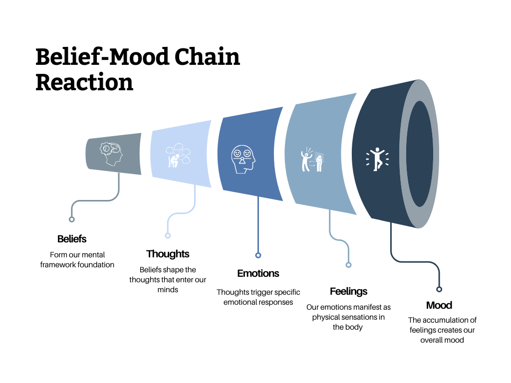 Have you ever wondered why you react to certain situations the way you do? Or why some people seem to handle life’s challenges effortlessly while others struggle? The answer often lies in a fascinating chain reaction that starts with our beliefs and ends with our mood and actions.